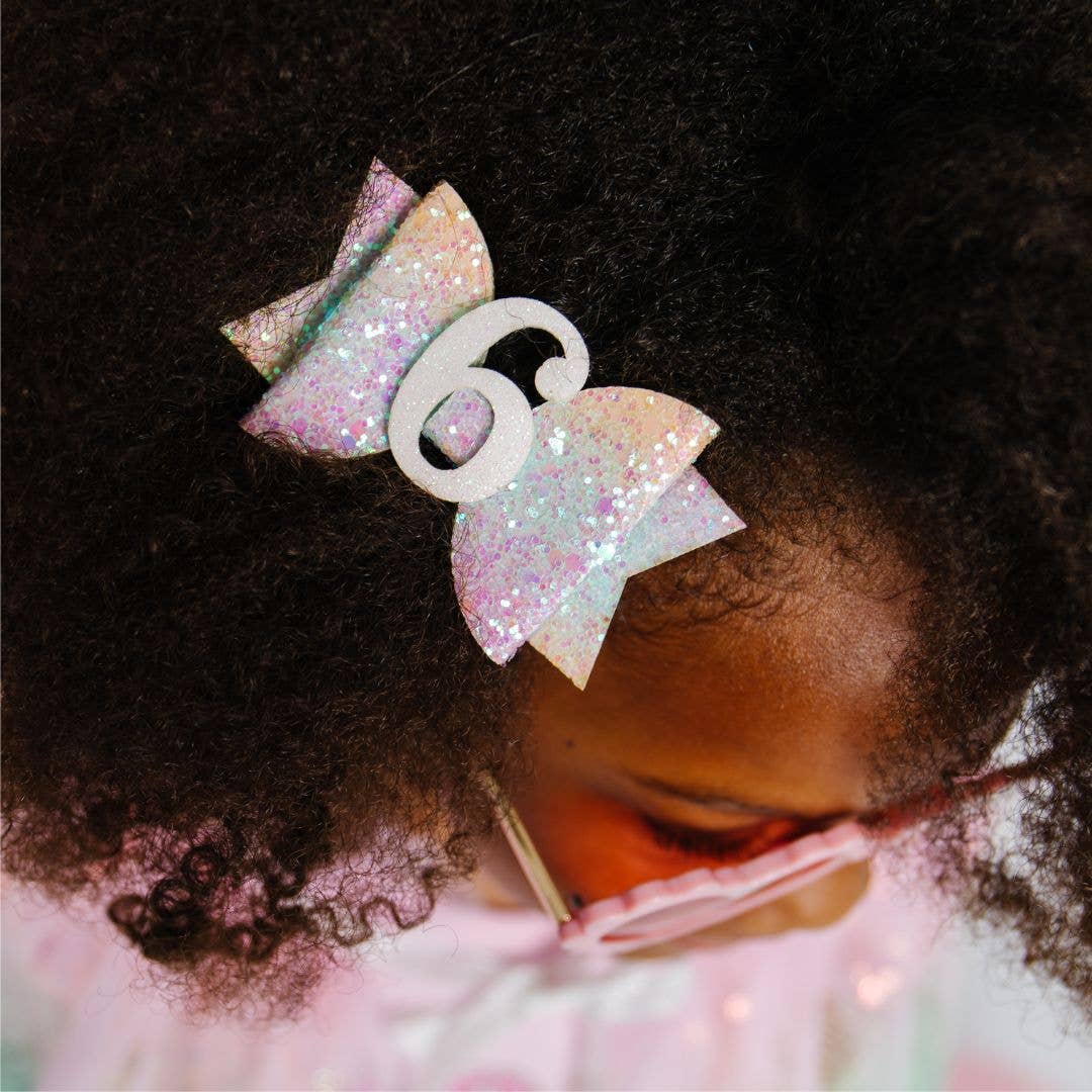 Every little girl needs the perfect hair clip to complete her look! The Pastel Rainbow Bow #6 Clip is the perfect hair accessory for celebrating a 6th birthday. Features: Pastel rainbow glitter bow with white glitter #6 Ribbon-covered alligator clip to grip the hair Glitter accents are “shed free” One size fits all Due to the ombre effect of the glitter, each clip will be slightly unique in color. Pair this hair clip with a matching Sweet Wink tutu and shirt for a complete head-to-toe outfit!